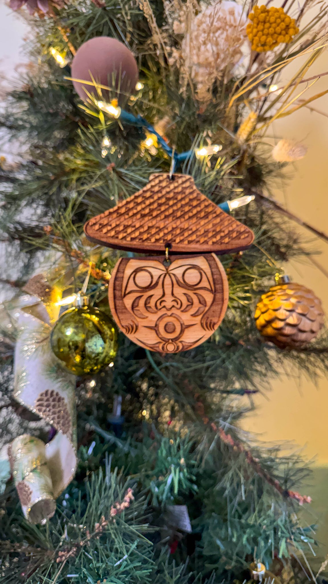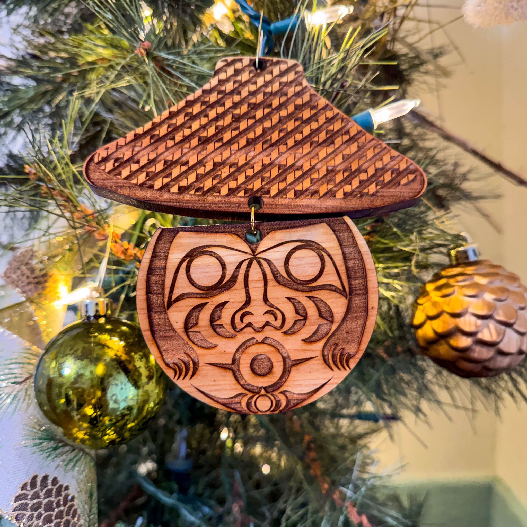 Cedar Weaver Christmas Ornament (6×5")A detailed 6×5" cedar ornament featuring a Coast Salish–style Cedar Weaver design.For those who honor tradition—patient, skillful, and weaving together culture, stories, and community with every strand.