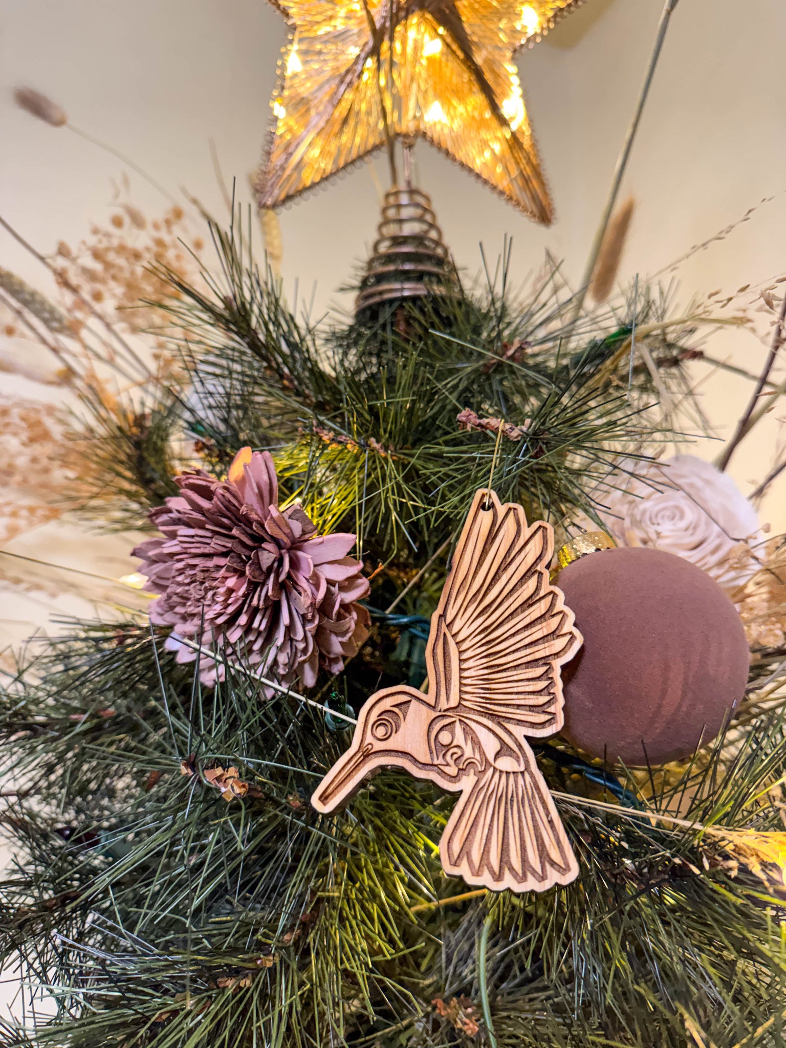 Hummingbird Christmas Ornament (4×3")A detailed 4×3" cedar ornament featuring a Coast Salish–style Hummingbird design.For those with bright spirits—joyful, quick-hearted, and always bringing light wherever they go.