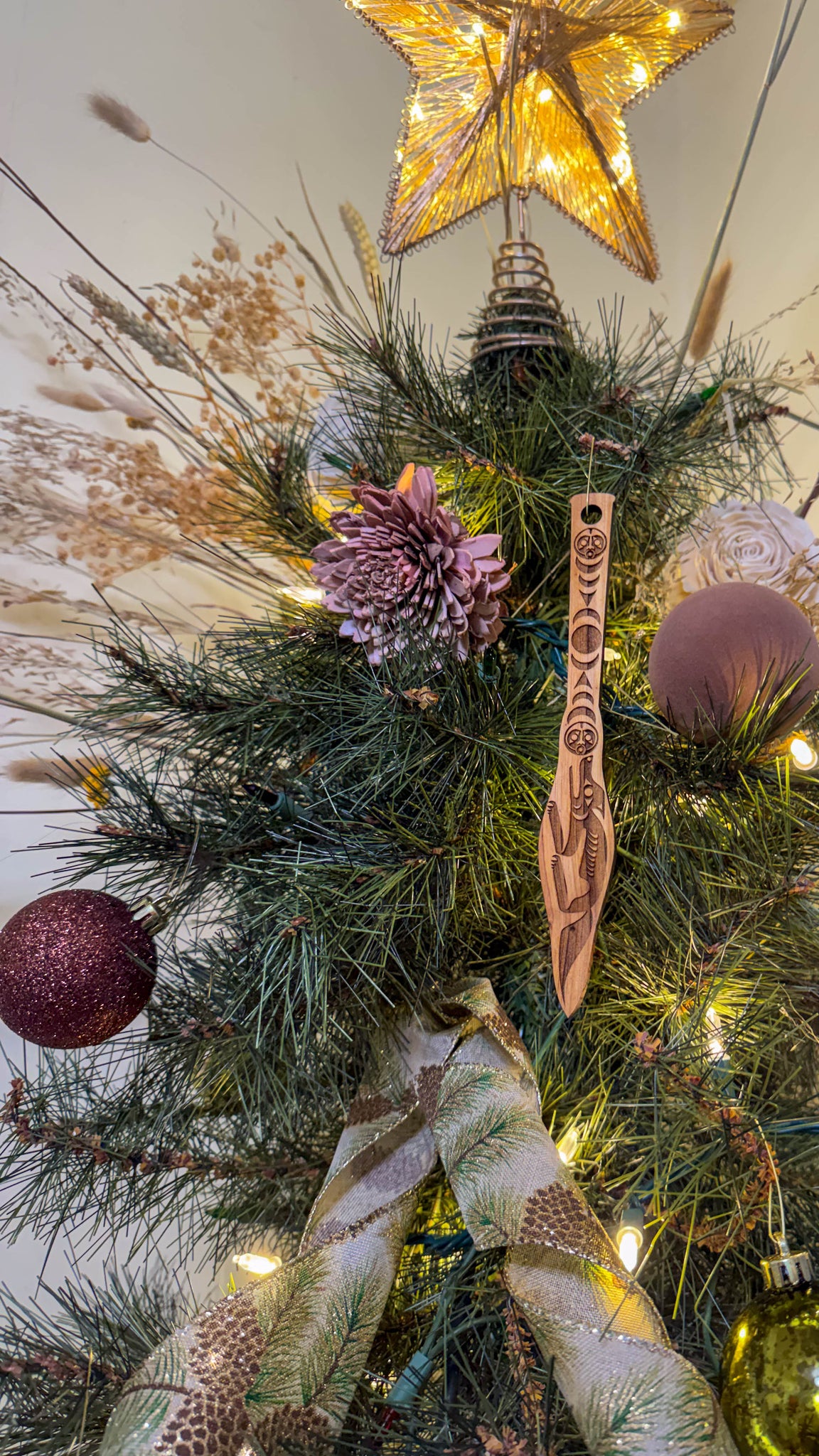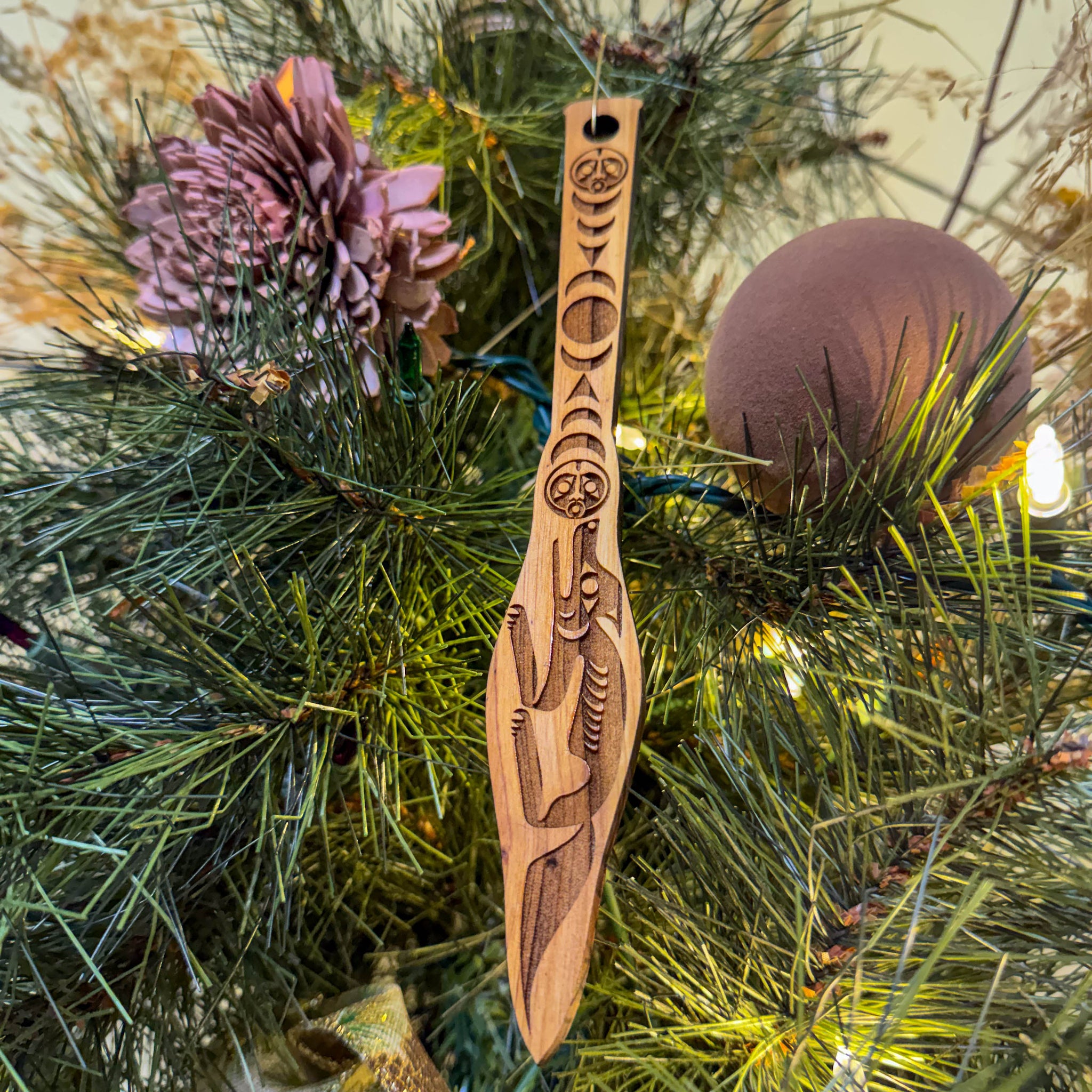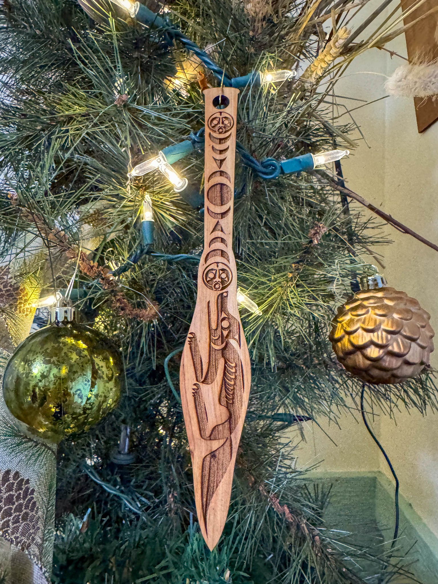 Wolf Moon Paddle Christmas Ornament (8×1") A detailed 8×1" cedar ornament featuring a Coast Salish–style Wolf and Moon Paddle design. For those who walk with intuition—loyal, observant, and guided by the quiet voice of the moon and the wisdom of the wolf.